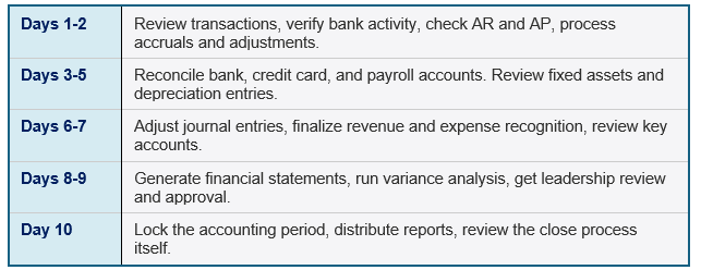 A well-run month-end close should take no more than 5 to 10 days, depending on the size and complexity of the organization. The process follows a clear sequence: